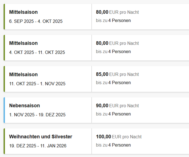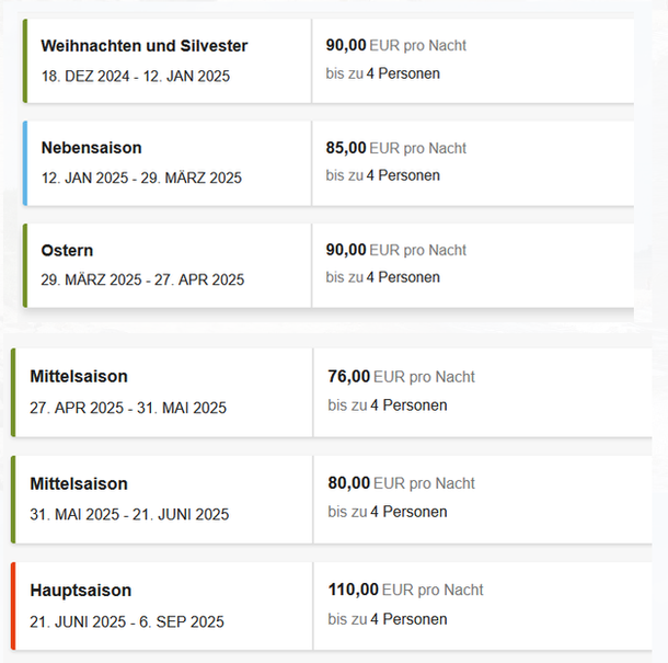 In der Saisonübersicht unten sind die Tagespreise aufgelistet.